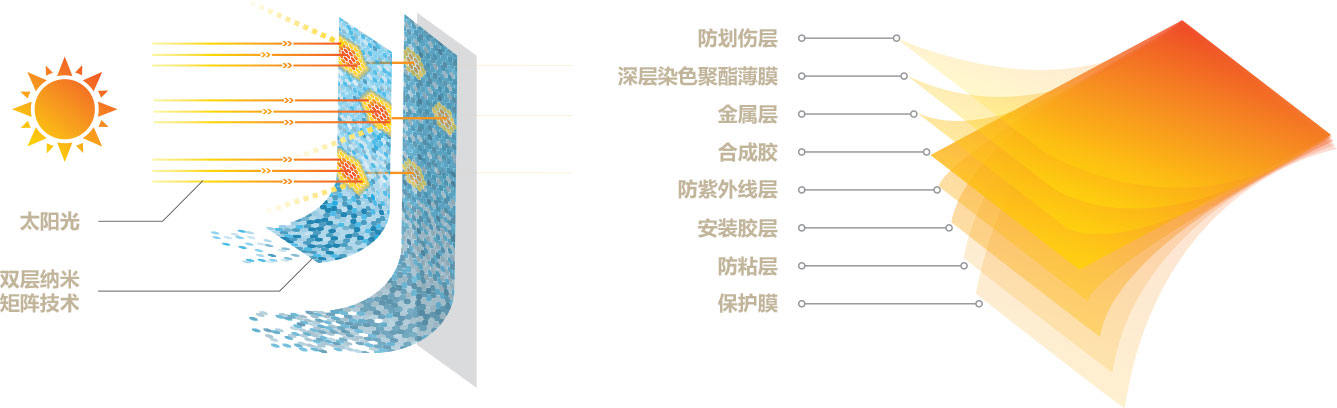 将金、银、铟等稀有金属通过高科技进行智能配比,均衡汽车窗膜各项性能,从而达到旗舰级全效表现,给您舒适、安全、高品位的驾乘体验。